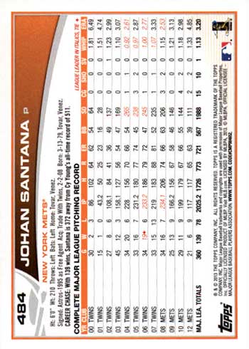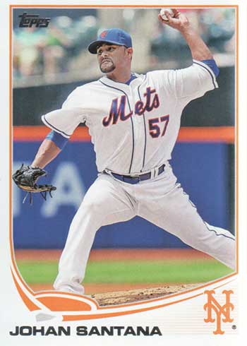 Since he didn’t pitch at all in 2013, Santana’s final Topps flagship card in that year’s set features a full stat back and serves as a great book end to his playing career.