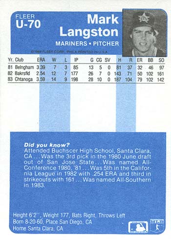 Other 1984 Fleer Update XRCs include pitchers Dwight Gooden, Bret Saberhagen, Mark Gubiza and Mark Langston. Seattle Mariners favorite Alvin Davis is also on the checklist.