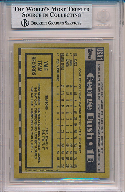 The BGS 9 Mint card is likely one of 100 copies given to President Bush during a February, 1990 White House visit by Topps’ Arthur Shorin.