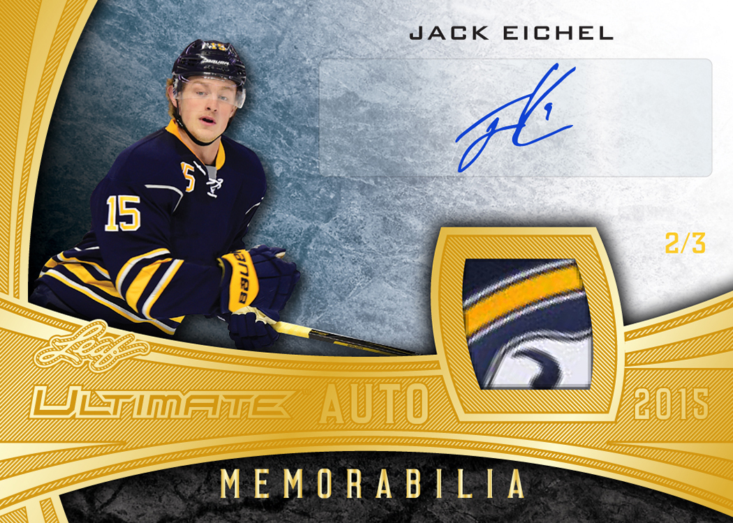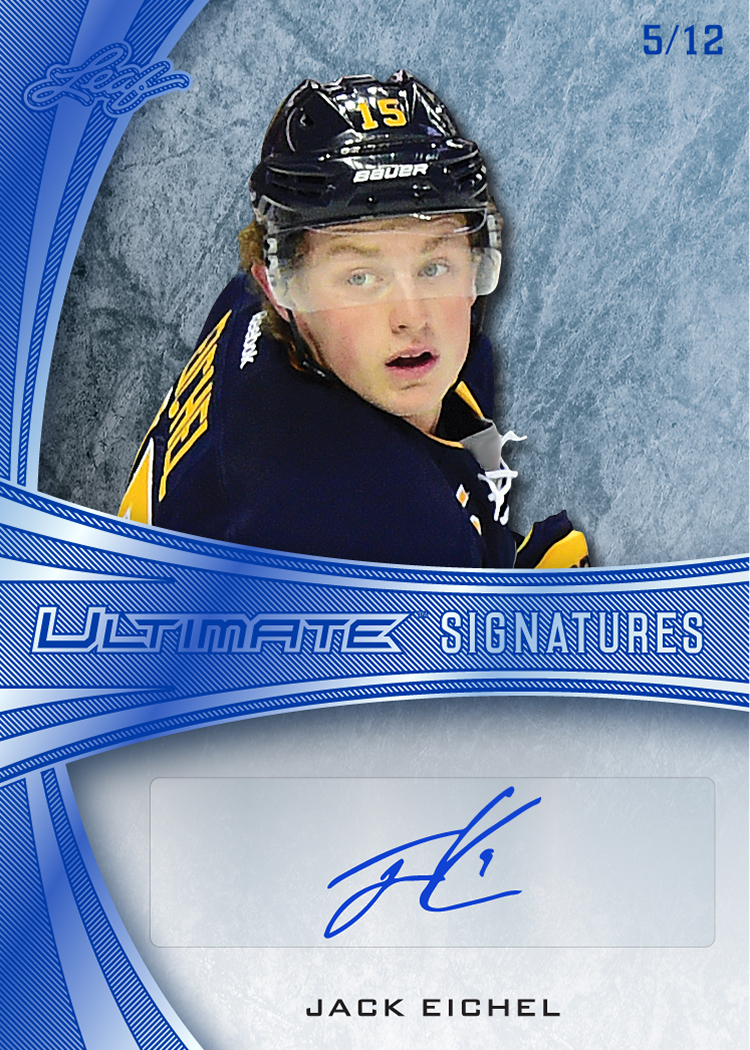 An exclusive autograph deal with hot Buffalo Sabres rookie Jack Eichel ensures that 2015-16 Leaf Ultimate Hockey captures the attention of the his fans and the autograph program for this release begins with Time Capsule Signatures. In addition to Eichel, 2016 NHL Entry Draft prospect Jesse Puljujarvi is part of the lineup along with legends like Patrick Roy and Gordie Howe.