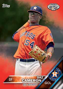 The 2016 Topps Pro Debut base set has 200 cards. It works in conjunction with the main 2016 Topps Baseball set, boasting the same design. Players are all pictured in the MiLB uniforms. Serial-numbered parallels come in Gold, Orange (/25), Red (/5), Printing Plates and Black (1/1).
