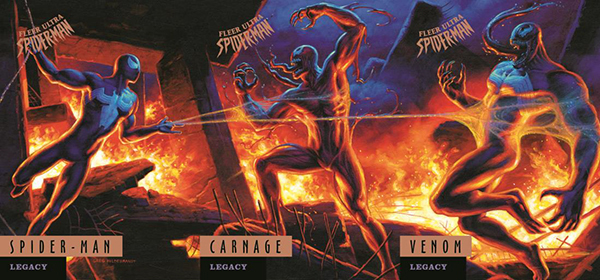 It starts with the 100-card base set. All use new art. That said, some of the subsets from the original 1995 Fleer Ultra Spider-Man release, as well as their designs, make a comeback and expand the checklist. Team-Ups, Milestones and Legacy all return. It also appears that the original Carnage USA subset has been tweaked to take Deadpool across America.