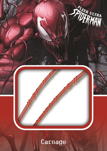 2017 Fleer Ultra Spider-Man avoids patch cards. However, the set does introduce Manufactured Webbing cards. Those with Spider-Man are numbered to 49. Venom versions have 25 copies. Carnage is the rarest at ten copies each.