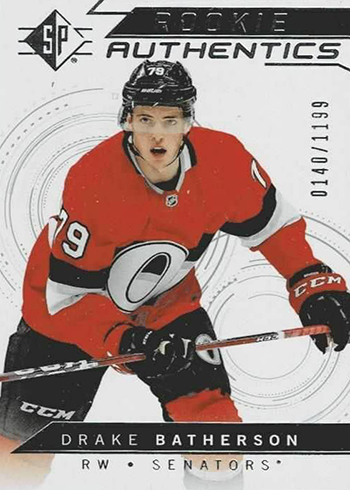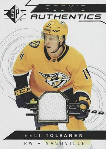Rookie Authentics are the basis for much of the autographs and memorabilia cards in 2018-19 SP Hockey. All 40 players have jersey versions, which combine to land 1:18 packs. More than 30 also have Rookie Authentics Signatures, which are 1:100 packs. Autographs also have Gold parallels, which have 25 copies each.