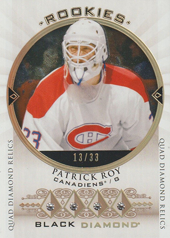 Similar to Maurice Richard in 2017-18 Black Diamond, Patrick Roy appears on a special Diamond Relic Rookies Retro card (/33).