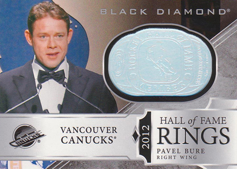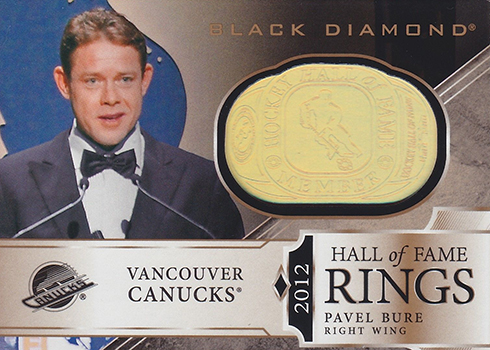 Hall of Fame Rings have a replica recreation of a ring embedded in the card. Base versions are 1:6 packs while Gold parallels are 1:13. Numbered Gold Autograph versions are also randomly inserted.