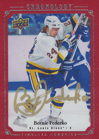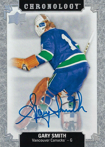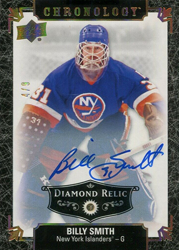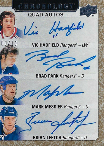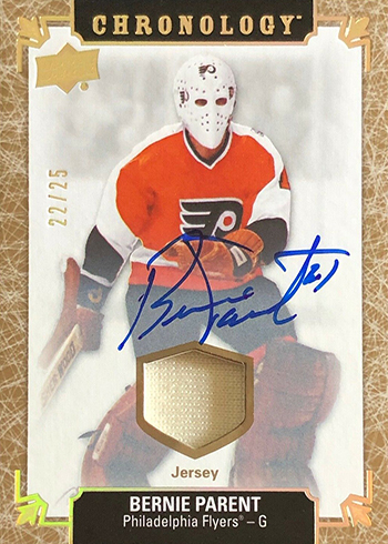 2018-19 Upper Deck Chronology Hockey cards are dedicated entirely to retired players. It’s the first set to use the manufacturer’s agreement with the NHL Alumni Association. Hobby boxes come with a single pack of four cards. At least one autograph is guaranteed. Two additional spots are reserved for either more signatures or chase cards.