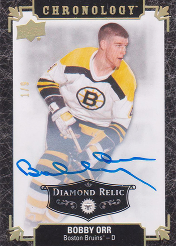 2018-19 Upper Deck Chronology Hockey has a couple of additional premium inserts whose concepts may be familiar to a lot of collectors. Diamond Relics come with a gem embedded in them. Averaging one per eight-box inner case, both regular and autograph versions have 36 copies each.