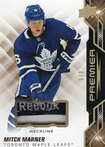 Mega Patch cards highlight the memorabilia offerings in 2019-20 Upper Deck Premier Hockey. These have large pieces of game-used gear like chest logos, sleeve numbers, commemorative logos and shoulder logos. Print runs vary from card to card, but none are higher than 25.