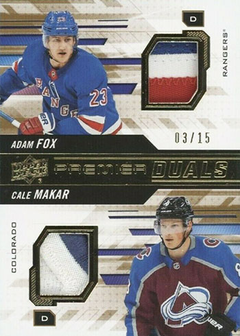 Premier Duals (/15), Trios (/10) and Quads (/10) are home to multi-memorabilia pieces. These have additional patch versions with print runs of five copies.