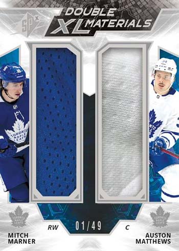 Double XL Duos Materials (/99 or less) return in 2021-22 SPx Hockey. Look around the hobby as a whole and there’s no shortage of dual-player memorabilia cards. These standout, though, thanks to their oversized swatches and distinct layout. Premium parallels are numbered to 10 or less.