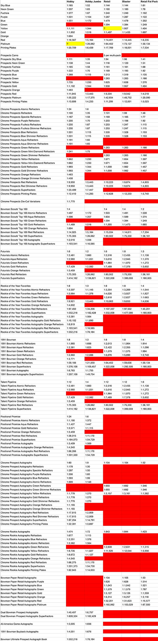 Extremely disappointing, especially with prices continuing to rise. Opened two hobby boxes and one jumbo box and not close to completing a set. Packs within the jumbo had identical base cards in the same sequence within the same box. Overloaded with “RC” for major league players and 1st Bowman cards seem much harder to pull. Between the three boxes I received dupes of almost every insert card and not close to completing any of those. Parallel pulls seem to be much more difficult, particularly for the jumbo box. Autos were very disappointing as well. The hot cards in the set also seem to be scarcer or perhaps the inclusion of the RCs is taking up more space. Maybe they are moving to push the Draft product more but I expected a lot more out of this and came away extremely disappointed considering what I paid retail for these. As I’ve read elsewhere, if you are looking to build a set, just wait to buy singles from the “breakers” who don’t want 99% of the cards in the box. Bowman put out a dud with this one.