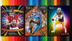 Color Wheel makes its pigskin premier. These have a minimalist design but a colorful backdrop that cover the rainbow all in the same image. Firestorm is another debut. For both of these, Gold Prizms (/10) and Black Prizms (1/1) are the lone parallels.