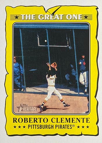 Roberto Clemente is the focus of The Great One, a 21-card set that spotlights not just his career but his life outside the game as well. The Great One Buybacks are original Clemente Topps baseball cards that have a special stamp noting the release.