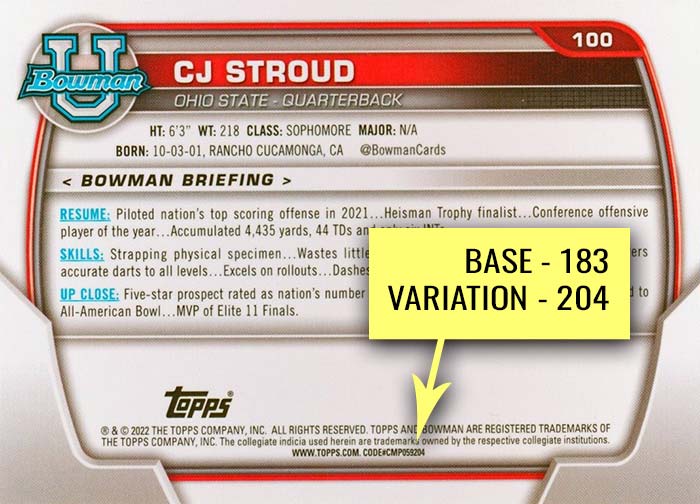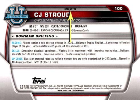 Besides the photos, there are two signs that can help confirm whether you have one of the 2022 Bowman Chrome University Football SSPs. Both involve looking at the back of the card.