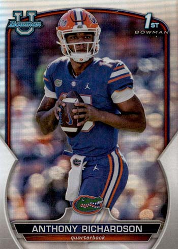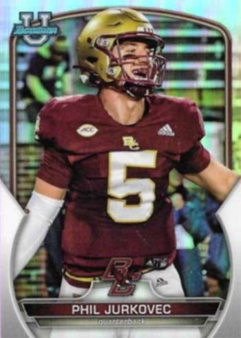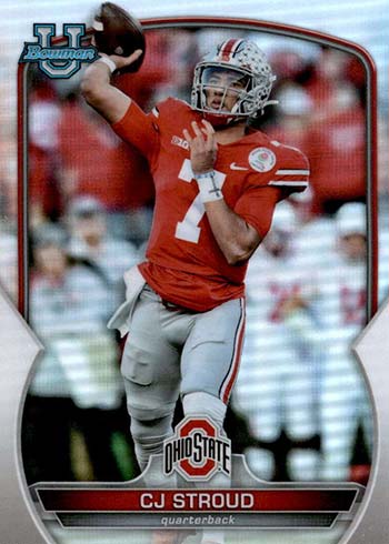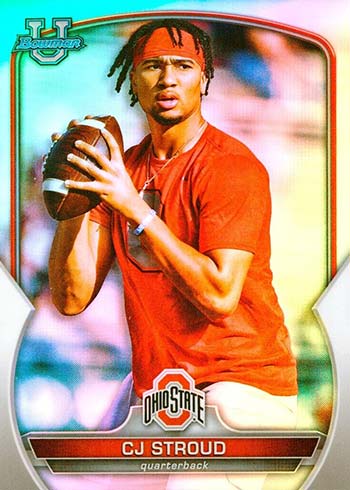 The 2022 Bowman Chrome University Football Variations showcase ten of the game’s top prospects. Like SSPs in other Chrome products, they also happen to be Refractors, which offer one way to look for them.