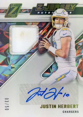 Zenith’s Rookie Patch Autographs round out the main set. Base versions for these are numbered to 299 or less and have one swatch. Parallels not only drop the print runs, but add additional swatches. These include: