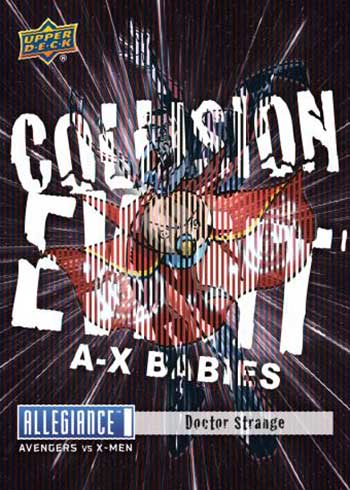 Collision Event (1:10 packs) and Collision Event A-X Babies (1:40 packs) both use lenticular technology giving cards a three-dimensional appearance.
