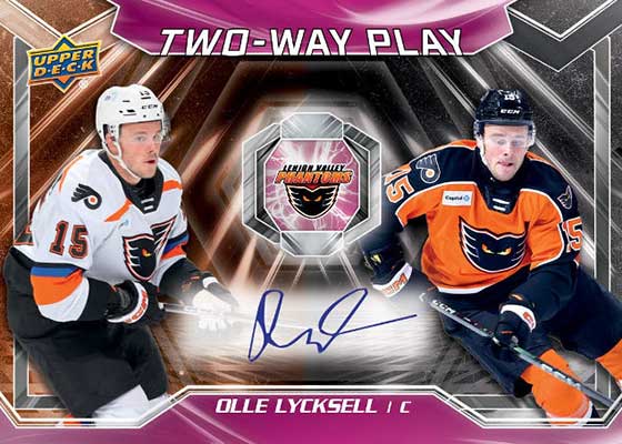 Three additional insert sets are a part of the checklist. Bound for Stardom (1:2 packs) put a spotlight on the AHL’s top prospects. Tendys (1:4 packs) are all about goalies. Finally, there’s Two-Way Play (1:5 packs).
