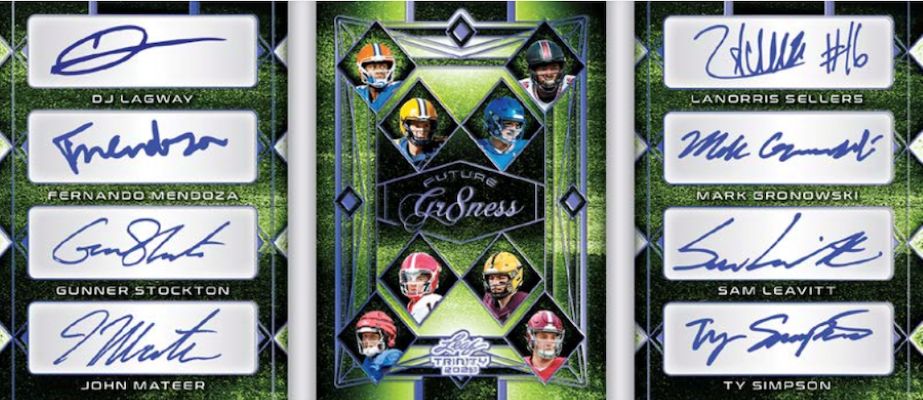 Collectors should expect to find three multi-signed cards per case, and an autograph from three of these players in every case: Ashton Jeanty, Bryce Underwood, DJ Lagway, Jeremiyah Love, LaNorris Sellers, Omarion Hampton, Sam Leavitt, Barry Sanders, Emmitt Smith, John Elway, Randy Moss, Patrick Mahomes, and Roger Staubach.