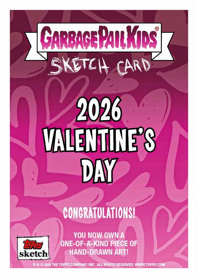 Love gets aflutter every February, and that’s even true for the weird and wild — and gross — Garbage Pail Kids characters, who find themselves pretty in pink or full of hearts in Topps’ 2026 Garbage Pail Kids Valentine’s Day trading cards.