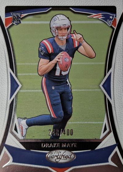 Another long-running football brand name is Certified, most known for its Mirror parallels. With a base rookie production run of /400, this is one of Maye’s more limited RCs, and it’s covered by 16 colorful Mirror parallels.