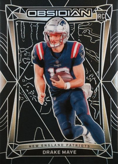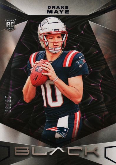 Panini Black utilizes a dark theme throughout the product, helping boost its premium feel. Rookies like Maye have seven parallels in the set, including the Royal (/99) version, which is pictured here.