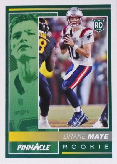 Panini leaned heavily into the 1991 Pinnacle Football design for its 2024 Encore product, giving first-year players like Maye a retro rookie featuring two photos on a design his parents might remember. Collectors need eight parallels to complete a rainbow.