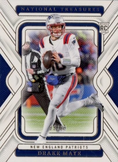 Many collectors look forward to their favorite player’s National Treasures Rookie Patch Autograph, but because of Maye’s autograph deal with Topps, such a card wasn’t possible in his case. He still appears on a base rookie numbered to /99, which lands among his most valuable RCs.