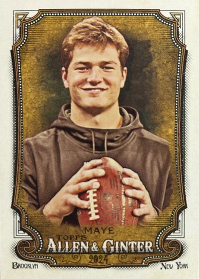 While not officially a rookie card, Maye appears as one of the non-baseball figures in the 2024 Topps Allen & Ginter Baseball set. There is also the online-exclusive, black-bordered Allen & Ginter X version and multiple parallels.