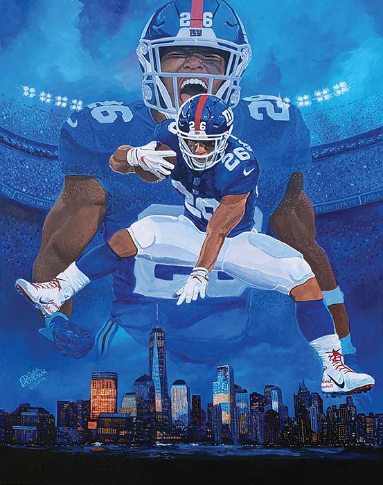“My mom passed away at 48 and my father died of cancer four months later on his 51st birthday,” Brown says. “After my mom passed, a spiritual awakening led me to start painting sports. I created a painting of New York Giants’ Mark Bavaro praying in the end zone, titled ‘A Moment of Silence.’”