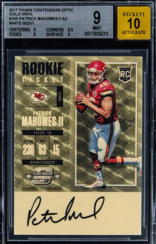 Put a Beckett slab with a Mint grade on a 2017 Panini Contenders Optic Gold Vinyl #103 Patrick Mahomes II AU White Box 1/1, Goldin Auctions sold the card for $98,820 after 36 bids with a buyer’s premium.