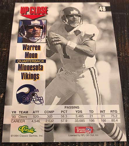 Lastly, the Warren Moon card back. With everything going on with the card fronts, Classic really toned it down with the backs. But it does look good.