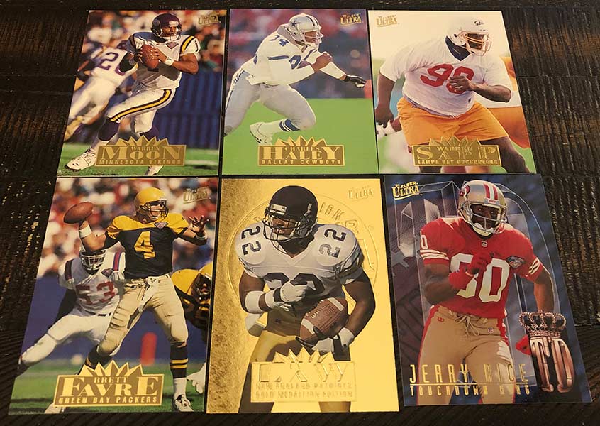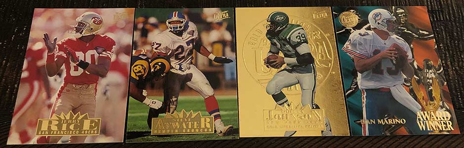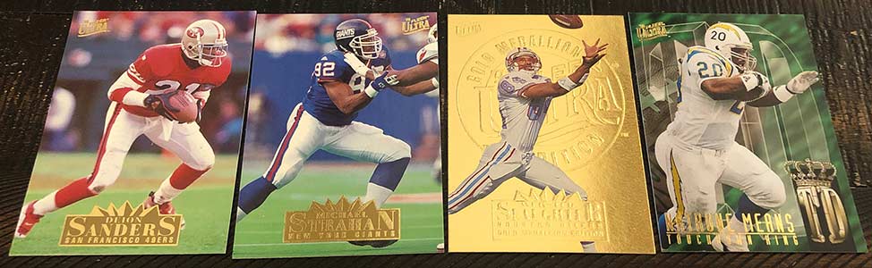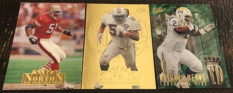 1995 Fleer Ultra Football was split into two releases, Series 1 and Extra, which is essentially Series 2. The Series 1 checklist features 350 base cards while Extra holds just 200. Series 1 stays true to the mid ’90s Fleer brand and has an insert per pack. Packs also hold a Gold Medallion parallel card. This release features one of my favorite Gold Medallion designs.