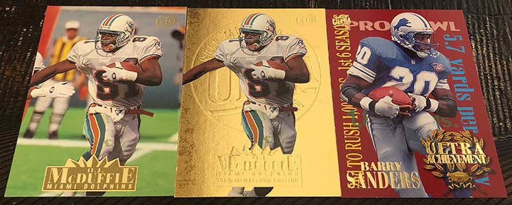 O.J. McDuffie, McDuffie Gold Medallion & Barry Sanders Ultra Achievements (1:7 packs)