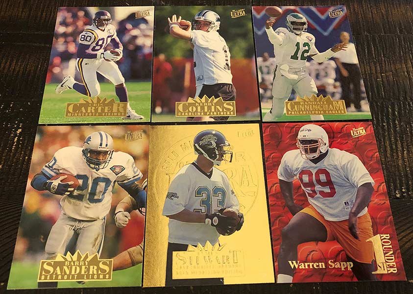 Cris Carter, Kerry Collins RC, Randall Cunningham, Barry Sanders, James Stewart Gold Medallion RC & Warren Sapp 1st Rounders (1:7 packs)