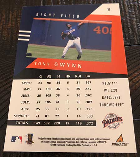 Lastly, the Tony Gwynn card back. Strangely, they went with a month-to-month statistics chart and didn’t even list the year the numbers came from. A quick check, and the stats come from 1997.