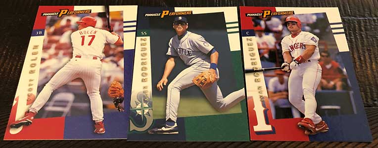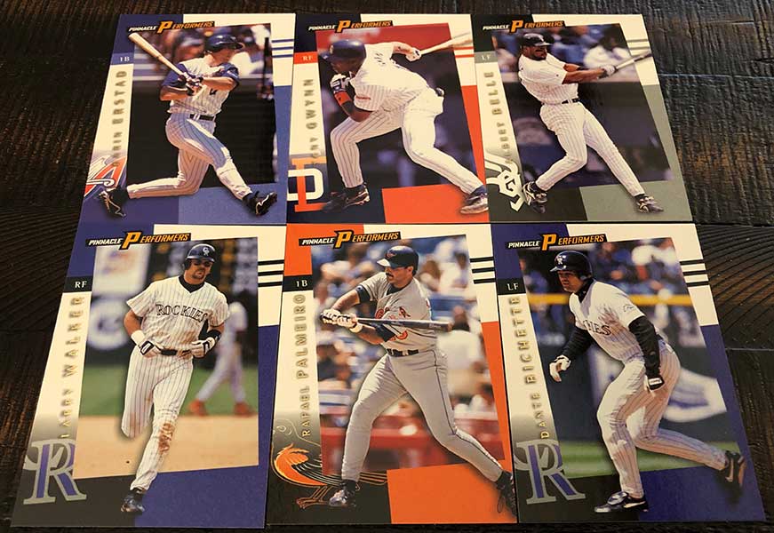 1998 Pinnacle Performers Baseball features a 150-card base set. The design prominently featured team colors, which is something I definitely appreciate. Along with the new name for the set, Pinnacle also introduced a parallel called Peak Performers that have foil fronts. Along with the easy-to-find Swing For the Fences inserts, there are three other tougher inserts to chase down.