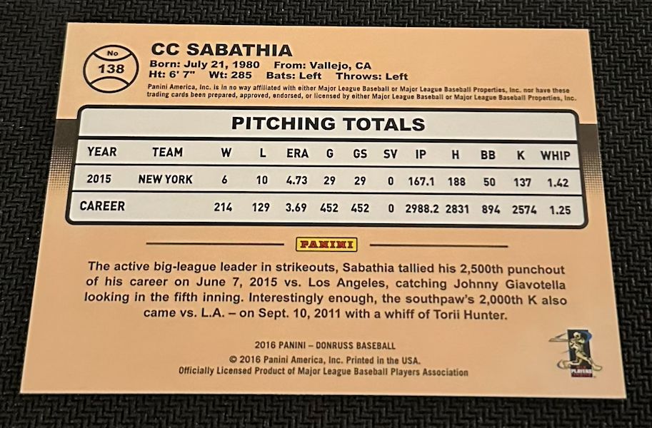 Lastly, the Sabathia card back. I have never been a fan of limited season stat lines. I prefer to see a player’s whole career on the backs.