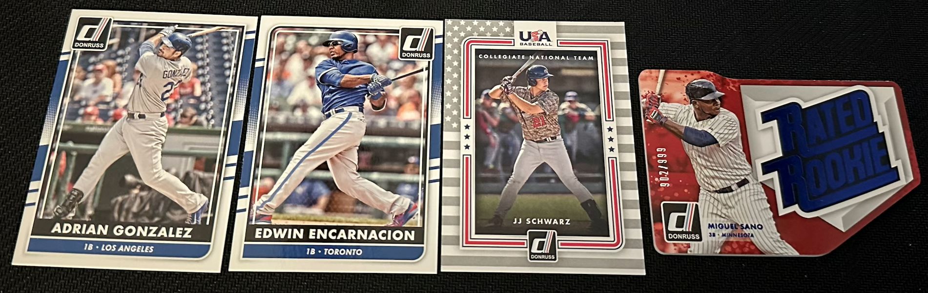 Adrian Gonzalez, Edwin Encarnacion, JJ Schwarz USA Collegiate National Team and Miguel Sano Rated Rookie Die Cut Blue /999