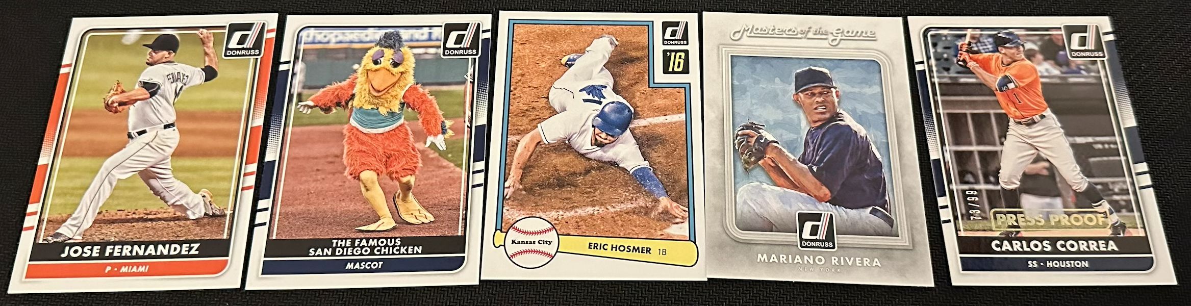 Jose Fernandez, The Famous San Diego Chicken, Eric Hosmer 1982, Mariano Rivera Masters of the Game and Carlos Correa Gold Press Proof /99