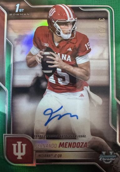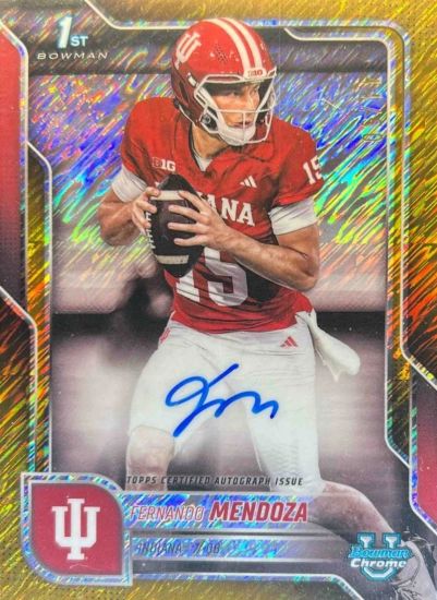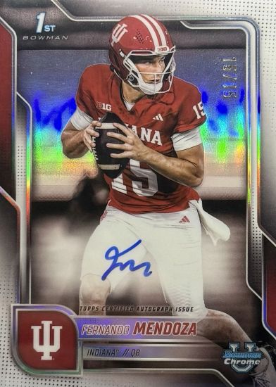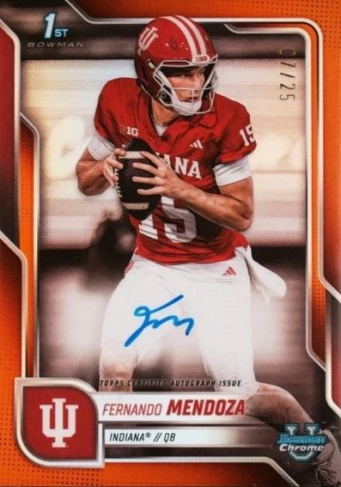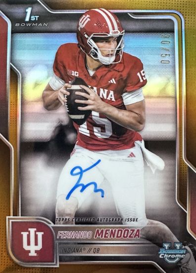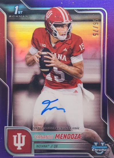 At No. 9 in the top 10: 2025 Bowman Chrome University Autographs Purple Refractors #BCAFME Fernando Mendoza /75. Since the big win and the announcement of Mendoza has a Heisman finalist, all of his cards are rising in value. This one ranges from $80 EX to $500 Mint.