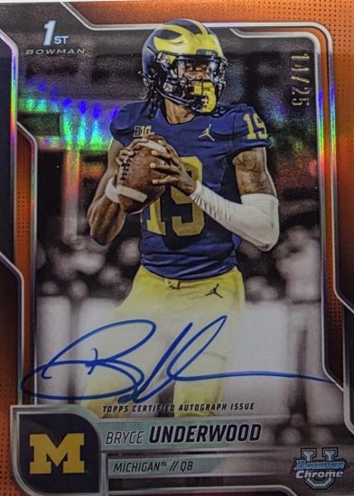 Of the cards with known values, 2025 Bowman Chrome University Autographs Orange Refractors #BCABUN Underwood /25 enters the top 10 at No. 9.