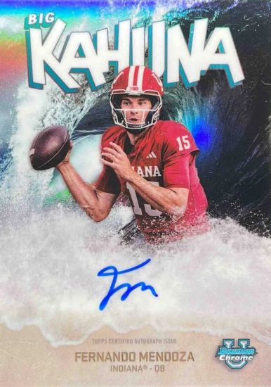 The only card on the list that does not have a serial number or a set print run: 2025 Bowman Chrome University The Big Kahuna Autographs Refractors #BKFM Fernando Mendoza. Top end asking prices vary from $500 to $600.