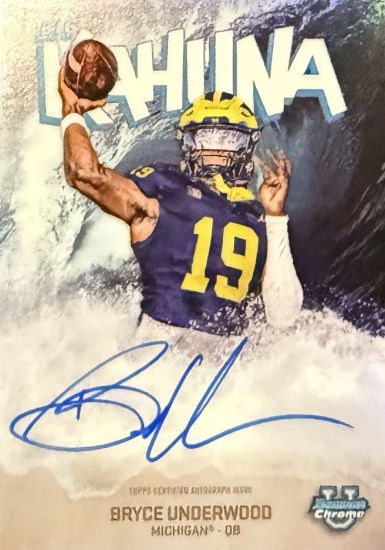 A bonus card image for the fans: 2025 Bowman Chrome University The Big Kahuna Autographs Refractors #BKBU Bryce Underwood. Values on this range from $200 to $400. The next tier with this insert: 2025 Bowman Chrome University The Big Kahuna Autographs Superfractors #BKBU Bryce Underwood 1/1.