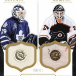 One of the more unique memorabilia cards in the set, includes the buttons from the players chin straps. In the subset, Strapping Lads the buttons are included as part of the card as shown with the preview image of Felix Potvin and Ron Hextall.