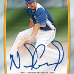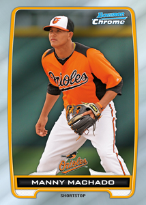 If I live to be 100, I will never understand Topps’ way of thinking when it comes to soliciting their Bowman products. In last year’s Bowman Draft Picks, they threw us a few crumbs when it came to revealing the identities of prospects in the initial checklist, and are doing it again here. I’d thought MAYBE they were turning the corner when it came to 2012 Bowman’s solicitation sheets, when they gave us half (55) of the prospect base checklist in advance, but all we know in this offering is that Machado and Hellweg will be included within this set. And no disrespect to Pratt Maynard, but he is hardly worthy of being one of the featured “highlights” in the Chrome autograph set.