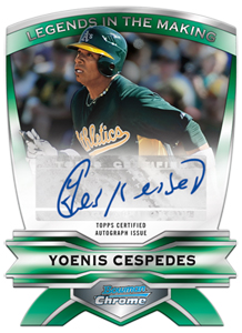 Non-prospect set insert cards will include a 25-card Legends in the Making diecut set (also with autographed versions limited to 15 or fewer copies) and Franchise All-Stars (a combo card of Futures Game players and MLB All-Stars) which also will be found signed. Players tentatively slated to have Legends autos include Albert Pujols, Cespedes, Darvish, Buster Posey, Clayton Kershaw and Felix Hernandez.
