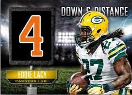 The Down and Distance memorabilia cards will utilize down markers for rarity of the card. First down will numbered to 99 or less, second down will be numbered 49 or less, third down will be numbered 25 or less, and fourth down will be numbered to 10 or less.