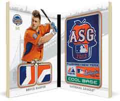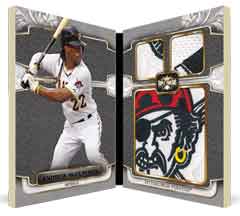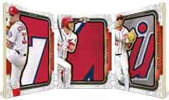 Also among the high-end offerings will be All-Star Jumbo Sleeve Patches — 1/1 booklets — with the standard All-Star patches limited to nine with a 1/1 Ruby version to chase. Another version will be 1/1 Jumbo Sleeve Team Patches and Logoman 1/1s. Another high-end piece from the All-Star lineup will be 1/1 laundry tag cards, while Letter Plus Relics (/3), Bat Knobs (1/1) and Letter-Number-Logo triple-patch booklets also will be found.